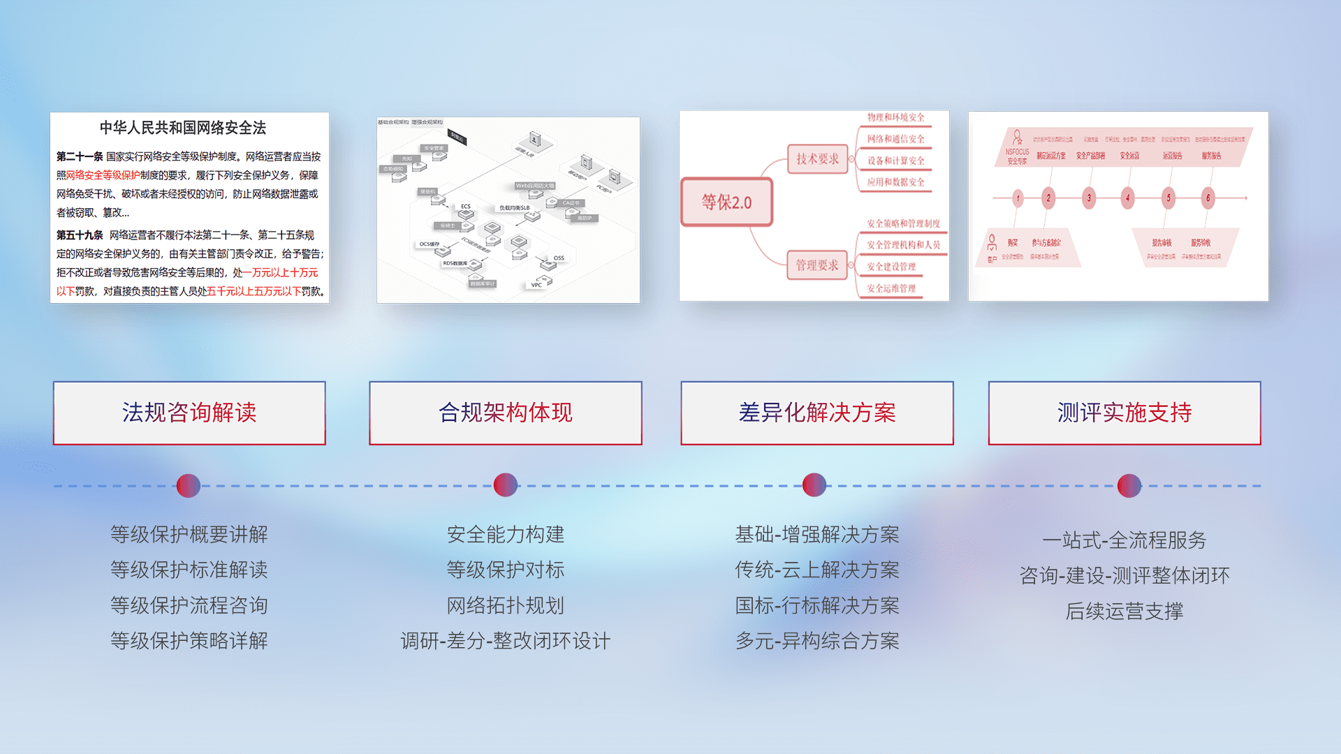 通过专业的法律咨询解读、、、、合规架构体现、、、、差异化解决方案、、、测试实施支持等服务,,,为客户量身打造等保合规体系。。