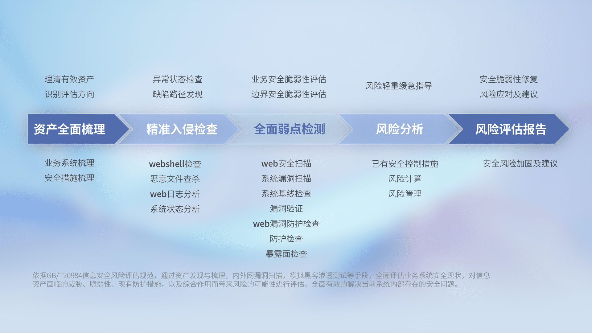 针对客户行业特性,,,以专业的安全服务+多厂商联合解决方案提供专属的一站式安全管理服务,,,帮助客户全面感知网络空间威胁,,基于识别、、、、检测、、、、分析、、防护、、、、监测、、响应的服务理论模型,,,从方案咨询、、、集成交付、、评估验证、、优化加固、、运维运营,,,致力于为客户提供完整的闭环管理式安全服务。。。。以实战经验为客户打造高抵御风险的安全体系,,,,帮助客户发现威胁、、、、对抗威胁、、、、处置威胁,,,不断积累安全对抗能力,,,,持续保障数字化安全。。。。